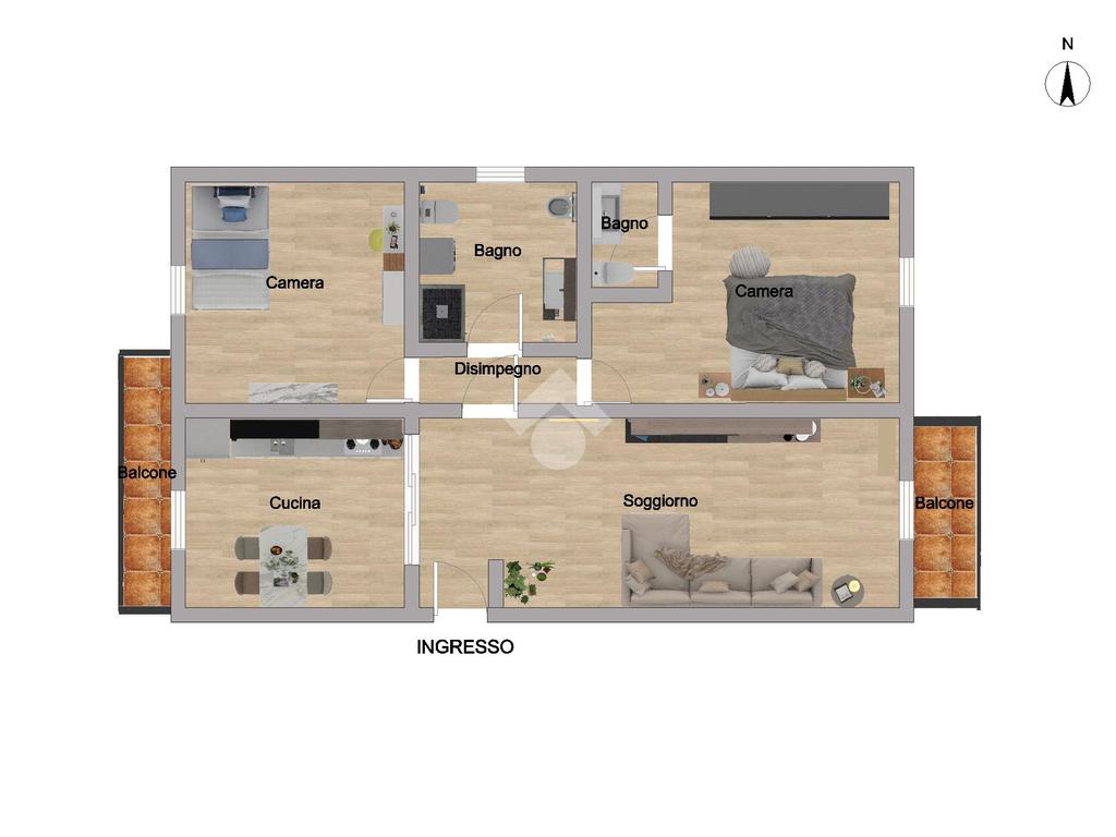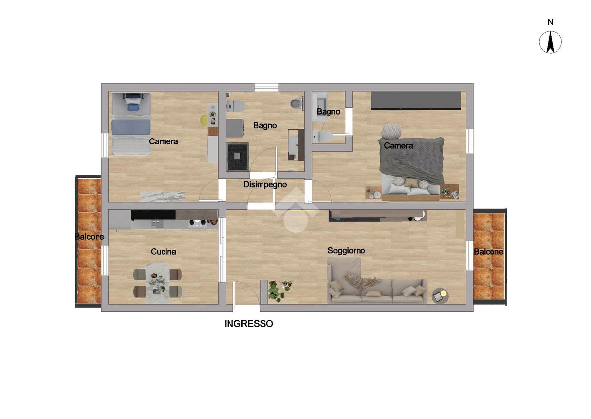 L'ingresso conduce ad un ampia zona giorno, composta da sala con accesso al balcone, ideale per momenti di relax, e da una cucina abitabile, anch'essa dotata di balcone, perfetta per la vita quotidiana.