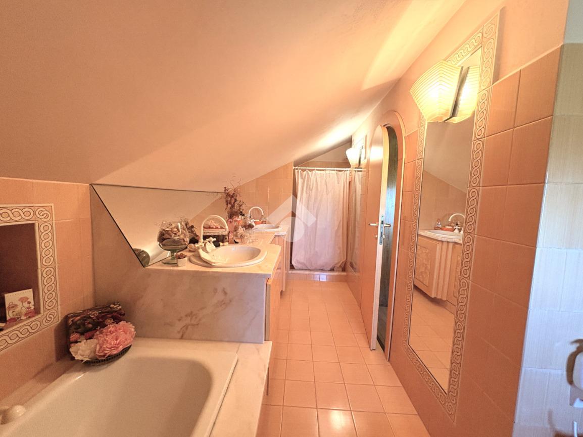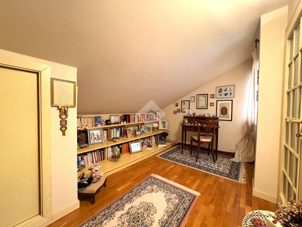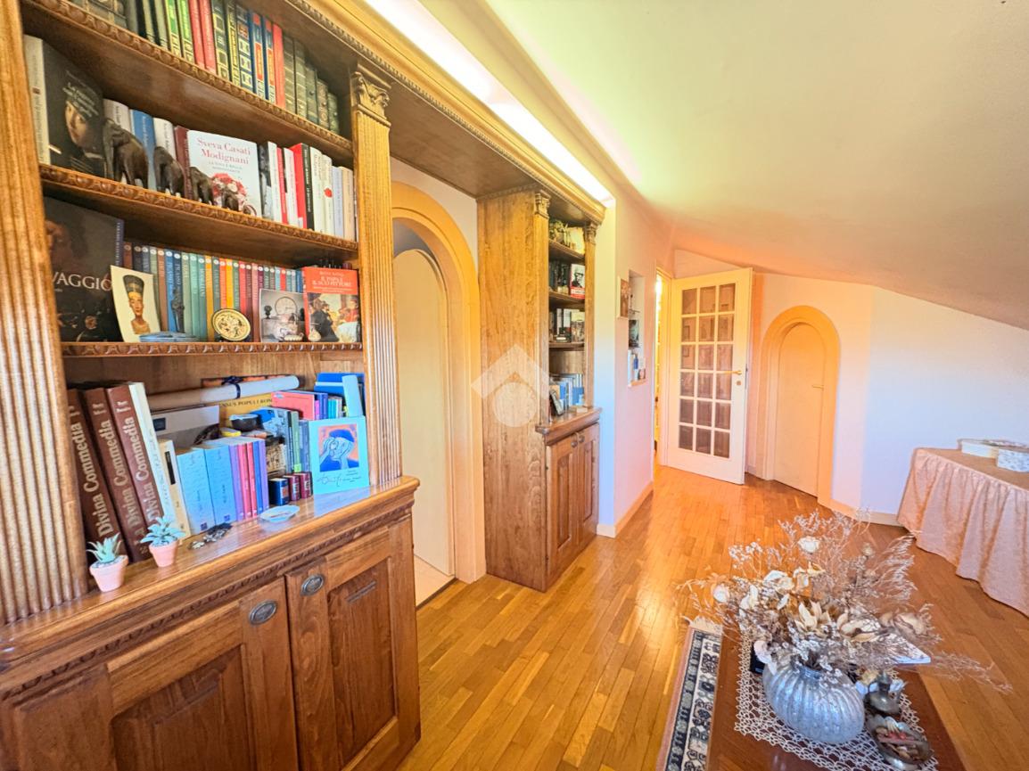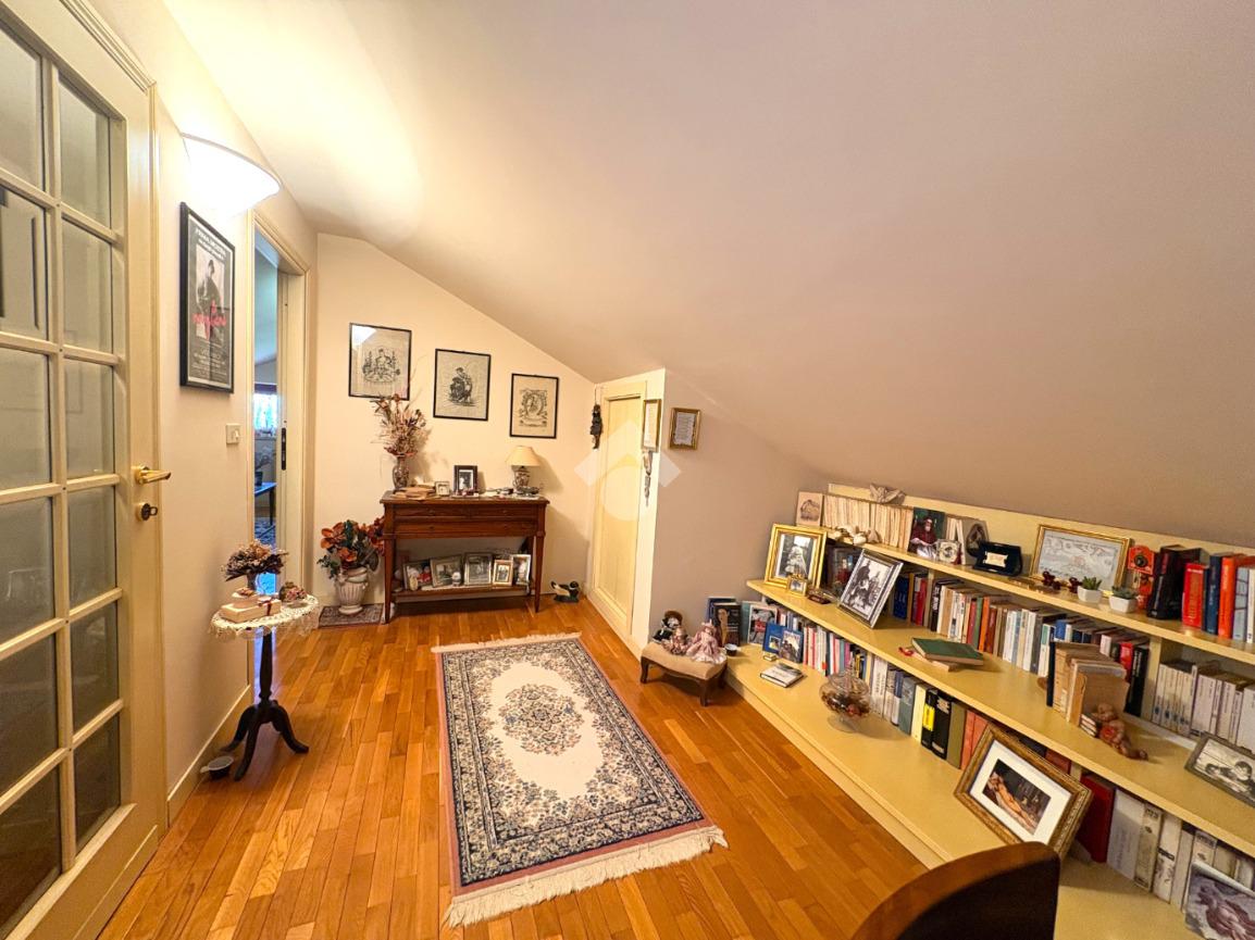 Dalla zona giorno è possibile accedere direttamente alla mansarda, realizzata con cura, con spazi ricreati su misura. Qui troviamo un grande ambiente con scaffalature a muro, ideale per gli amanti della lettura, un locale che può essere adibito a studio o sala hobby e un bagno unico nel suo genere in muratura.